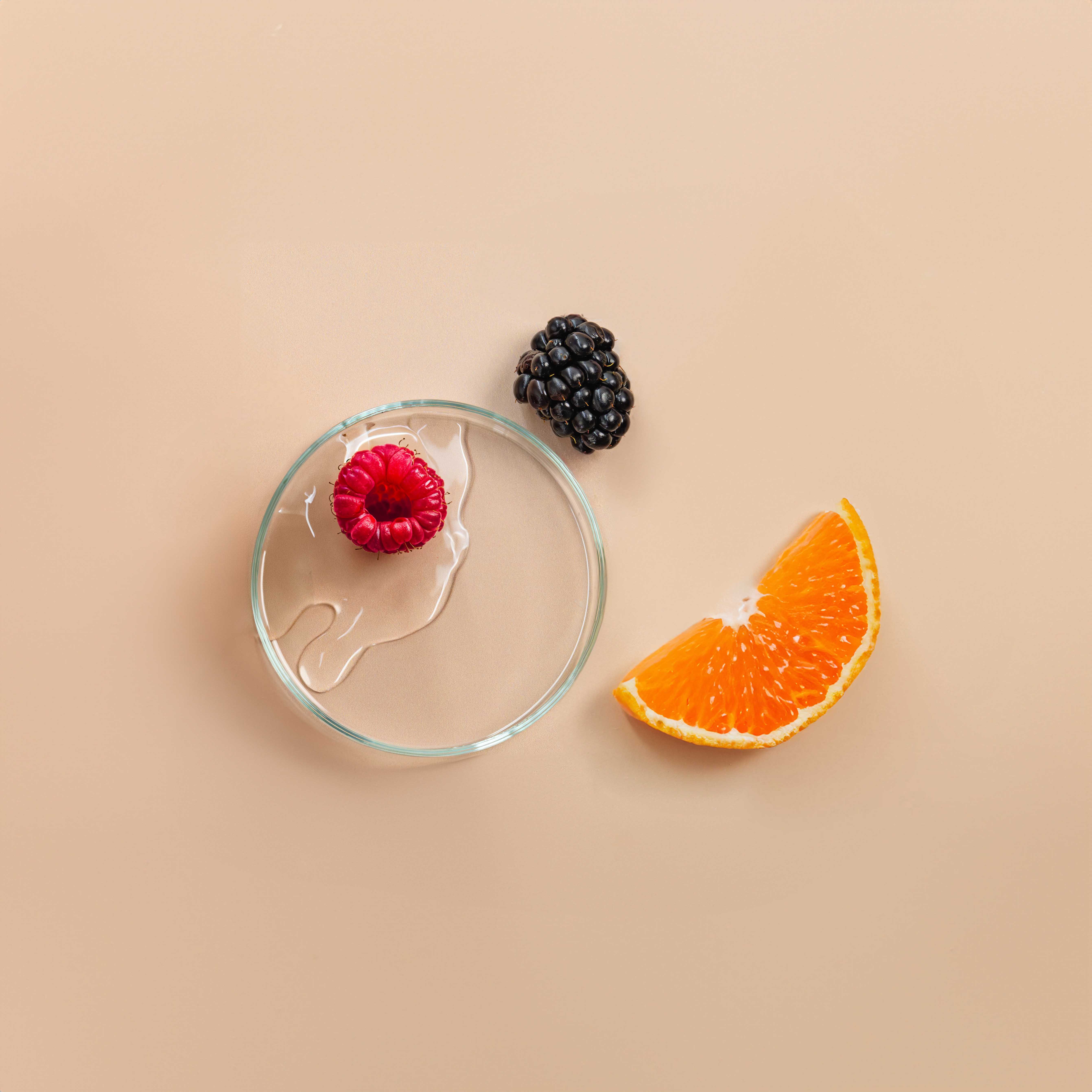 Barevné rekvizity: Využití světlých barevných rekvizit jako ovoce (maliny, jahody), květiny (např. ibišek) nebo listy, které jsou rozmístěny okolo produktů a vytváří hravou, neformální kompozici.